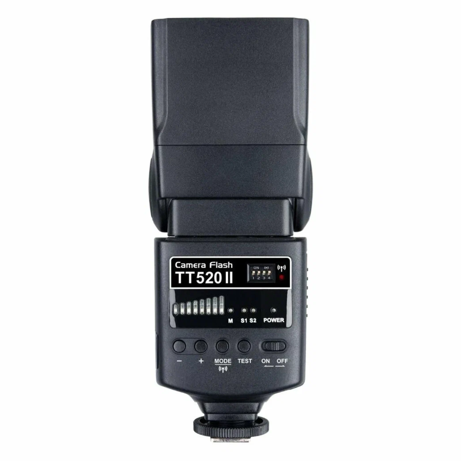 Godox TT520II — это простая и надёжная накамерная вспышка, рассчитанная на ручное управление освещением и работу как с камерой напрямую, так и в составе беспроводной системы. Она обеспечивает мощный свет даже при съёмке в условиях низкой освещённости, даёт гибкую регулировку мощности и может работать с большинством DSLR- и беззеркальных камер, что делает её удобной для начинающих и продвинутых фотографов. Ключевые характеристики: – Ведущее число: 33 (ISO 100, 105 мм) – Диапазон регулировки мощности: от 1/1 до 1/128 — позволяет точно настраивать свет в нужной сцене – Режимы вспышки: M (ручной), S1 и S2 (оптические режимы ведомой вспышки) – Питание: 4 батарейки AA, компактный и лёгкий корпус — удобно для мобильной съёмки и выездов