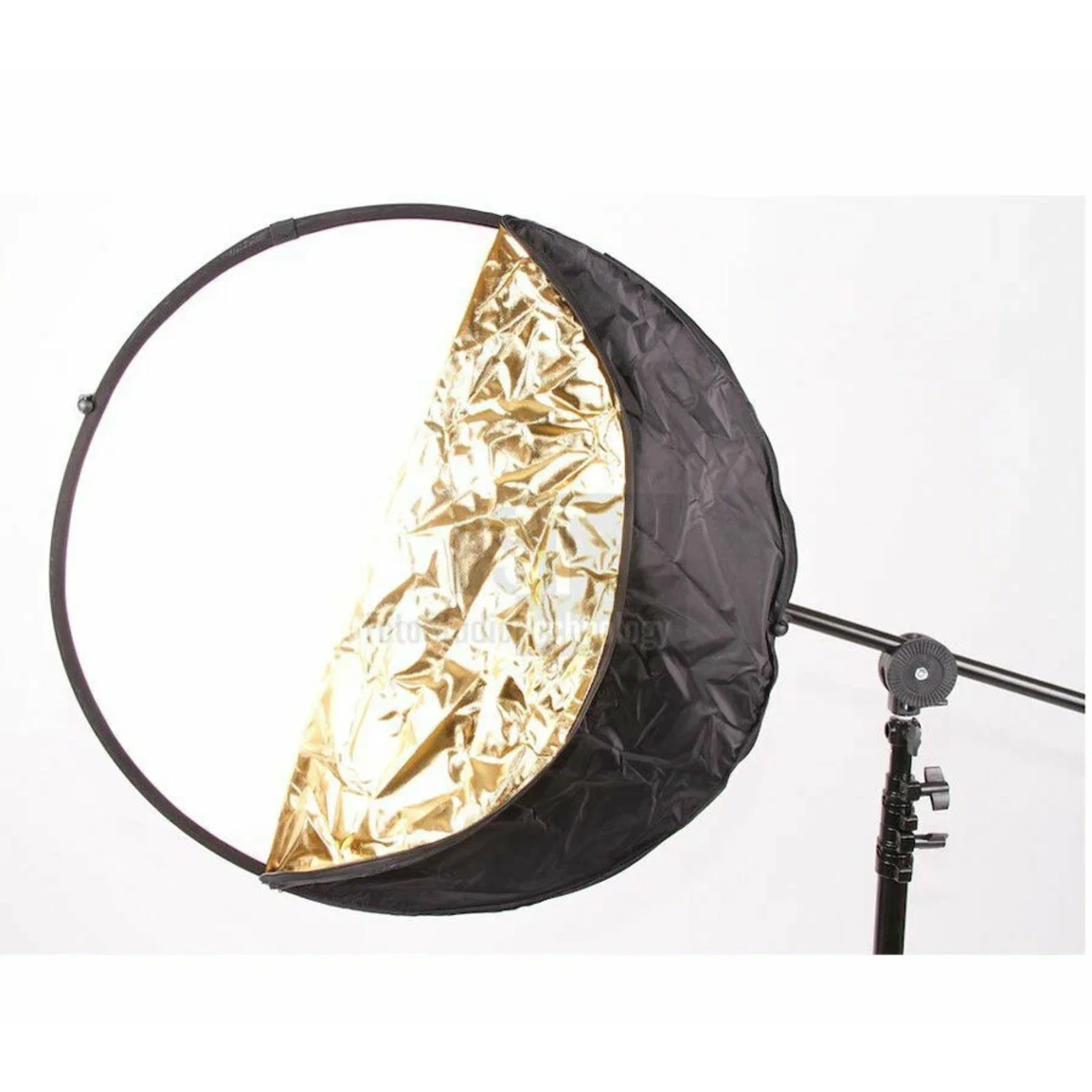 Отражатель 80 см 5-в-1 — это складной фотосветовой аксессуар, предназначенный для управления светом при фото- и видеосъёмке, который даёт возможность мгновенно менять характер освещения: от мягкого отражённого света до холодного контрового или тёплого заливающего. Он удобен для портретной, предметной и репортажной съёмки, особенно когда нужен контроль над тенями и светом без дополнительных световых приборов. Компактный, лёгкий и мобильный — отражатель легко брать с собой, быстро разворачивать и использовать на локации. Ключевые характеристики: – Диаметр: 80 см — обеспечивает достаточную площадь отражения света – 5 функций (поверхностей): серебристая, золотая, белая, чёрная и диффузная — даёт гибкость в освещении – Складывающийся корпус — удобно хранение и транспортировка – Лёгкий вес — комфортен при ручном удержании или на стойке – Универсальность — подходит для студийной и выездной съёмки, портретов, предметки, репортажа