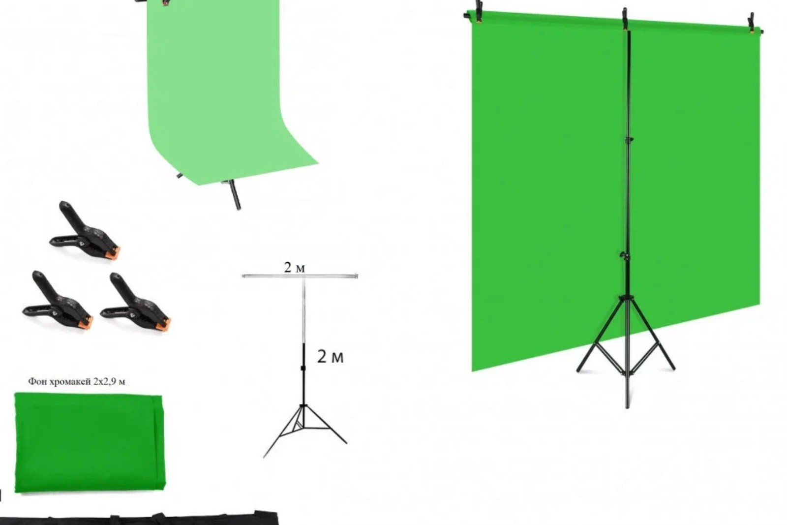 Фон изготовлен из специальной ткани зеленого цвета. Может использоваться для создания видео, которое предполагается корректировать в видеоредакторе. Фон позволяет создавать на видео нужный эффект и применяется в качестве хромакейного цвета, требующего минимум временных затрат при замене фона или его обработке. Стойка с подставкой для фона выполнен из алюминиевого сплава, который прочный и лёгкий при переноске. Фотофон можно использовать для выездных съёмок, выставок, фотосессиий, мероприятий за счет лёгкой конструкции и удобной сумки для переноски. Высота держателя для фона регулируется в диапазоне 67-200 см. Размер фона Хромакей: 2х2 метра