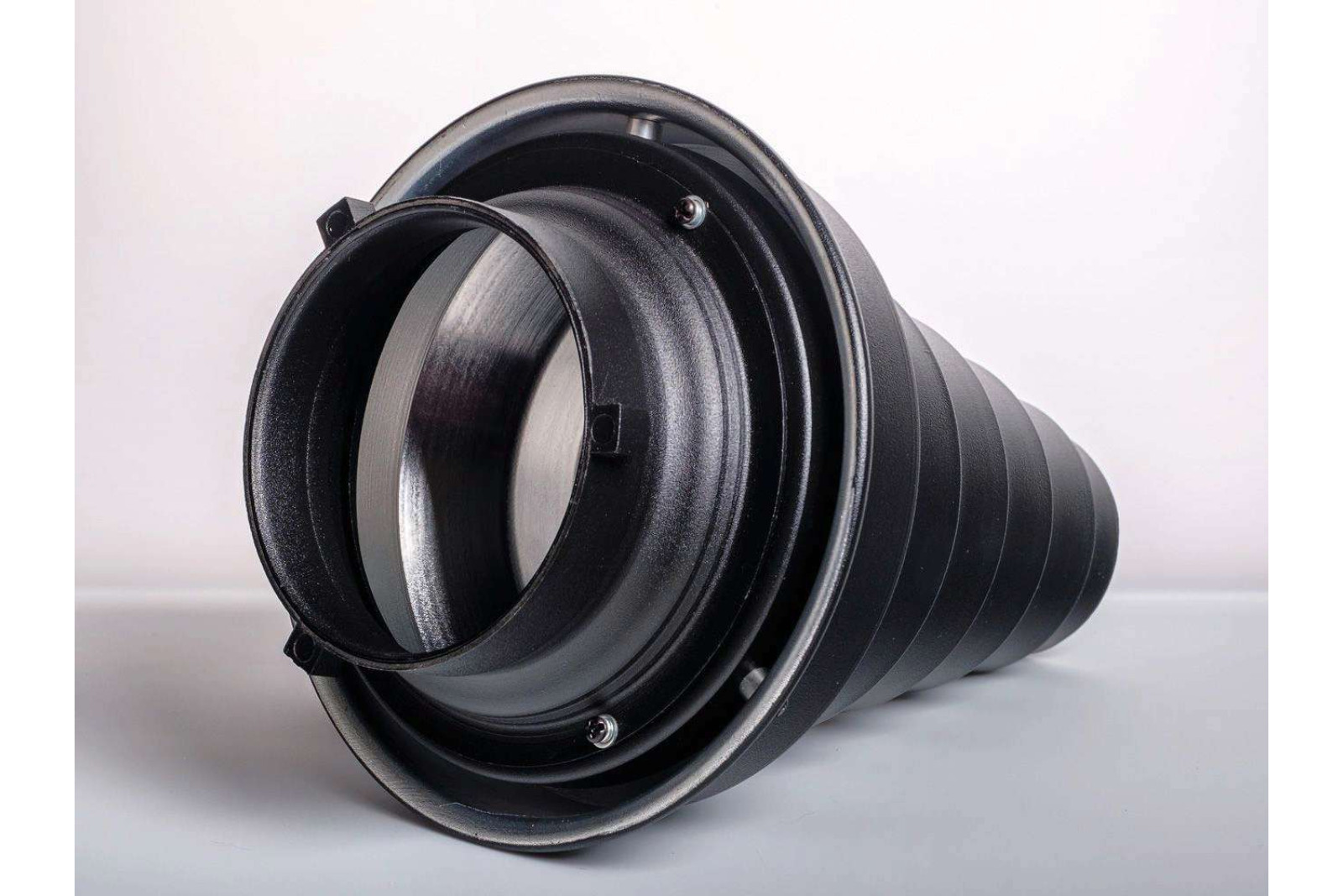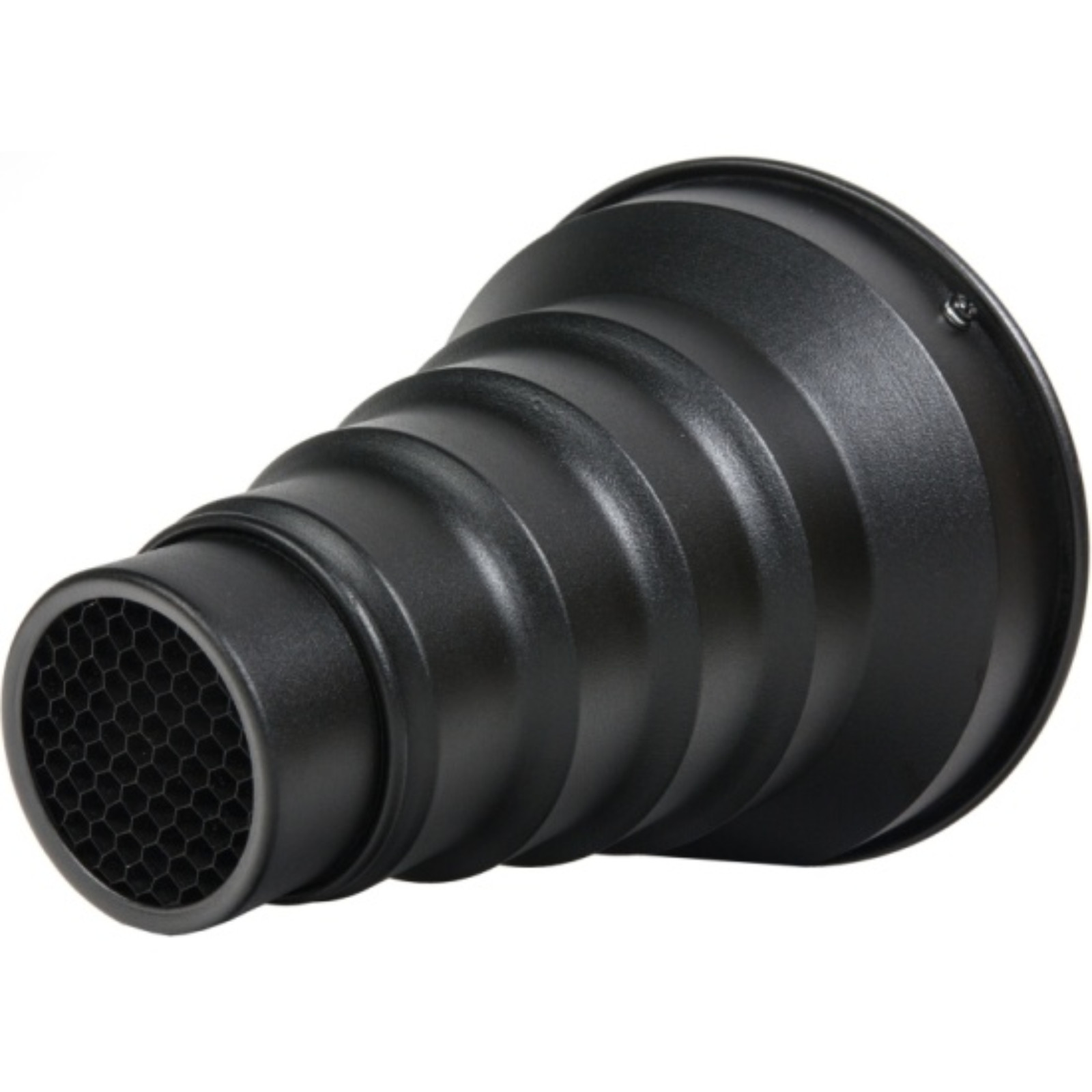 Конусный рефлектор (снут), тип крепления Bowens Предназначен для получения узконаправленного освещения. При использовании конусных рефлекторов на студийных вспышках не рекомендуется включать моделирующий свет, это приведет к перегреву прибора. Конусные рефлекторы нашли широкое применение при съемке художественных натюрмортов и в предметной съемке. Использование сот позволяет существенно сузить световой поток, а применение цветных фильтров - добиться необычных эффектов.