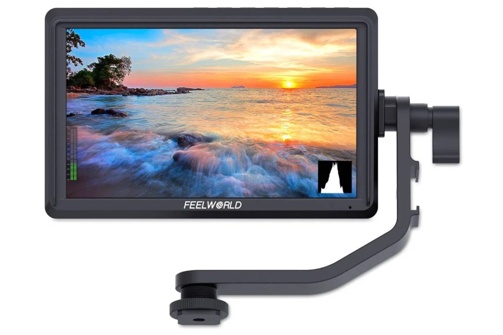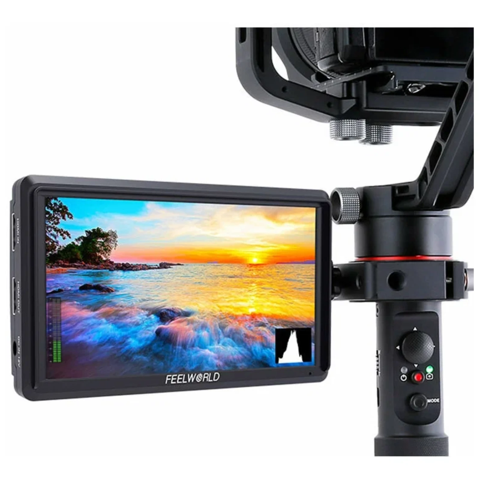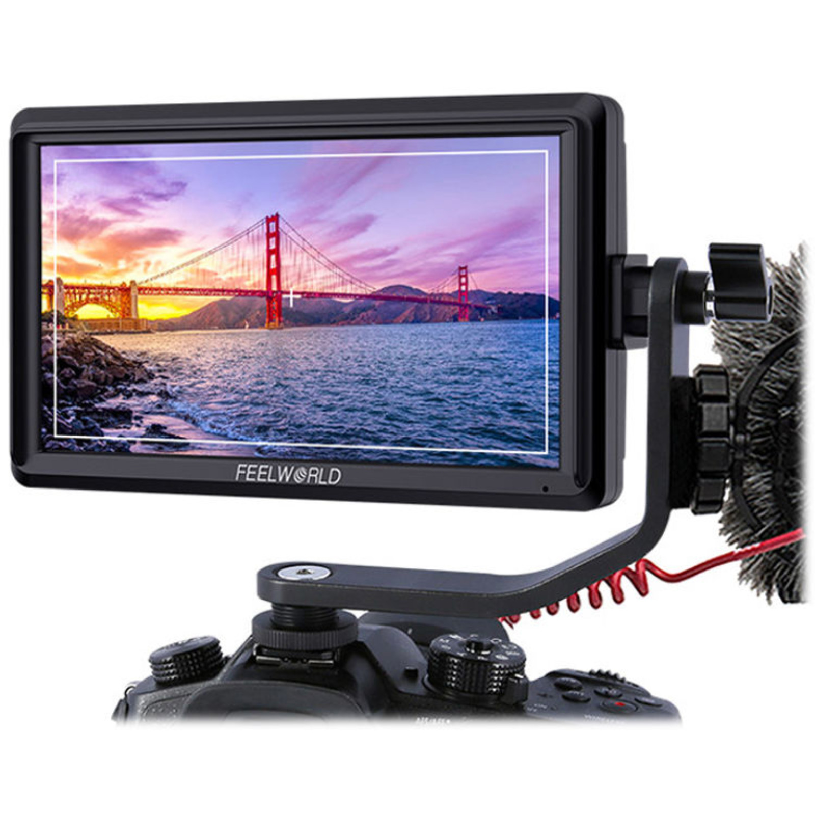 Современный накамерный монитор с IPS матрицей 5,5 дюймов с физическим разрешением 1920x1080 и поддержкой HDMI сигнала 4К. Помимо входа HDMI, в мониторе также присутствует и выход HDMI, что позволяет передавать сигнал, к примеру, с помощью видеосендера на удалённый монитор. В комплекте с монитором поставляется удобное Г-образное крепление, жестко фиксирующая монитор на горячем башмаке камеры с возможностью вертикального изменения угла. На креплении имеется "холодный башмак" для фиксации света, микрофона или приёмника радиопетлички.