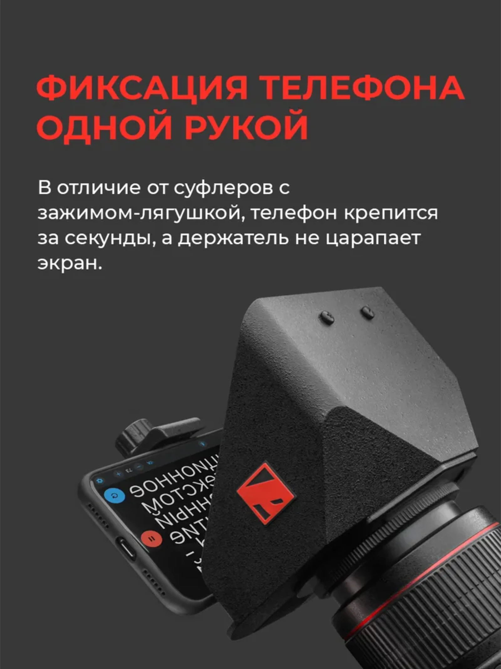 Телесуфлер используется для чтения текста в процессе съемки. Он предназначен для применения в видеопроизводстве для съемок интервью, презентационных фильмов, рекламных роликов, музыкальных клипов, интервью, видеоблогов и других видов съемок. Прибор транспортируется и хранится в защитном футляре, обеспечивает быструю подготовку к работе даже в полевых условиях: достал из сумки, пристегнул к объективу, запись! В комплекте поставляется 8 колец для разных объективов. Кольцо накручивается на объектив, суфлер прищелкивается к кольцу. Опционально есть переходники под нестандартные объективы (приобретаются отдельно). В мобильном приложении есть все необходимые функции для прокрутки текста, а наиболее часто используемые настройки вынесены на экран воспроизведения. Набирайте тексты на сайте и они будут синхронизироваться с приложением. Приложение совместимо с любыми Bluetooth пультами.